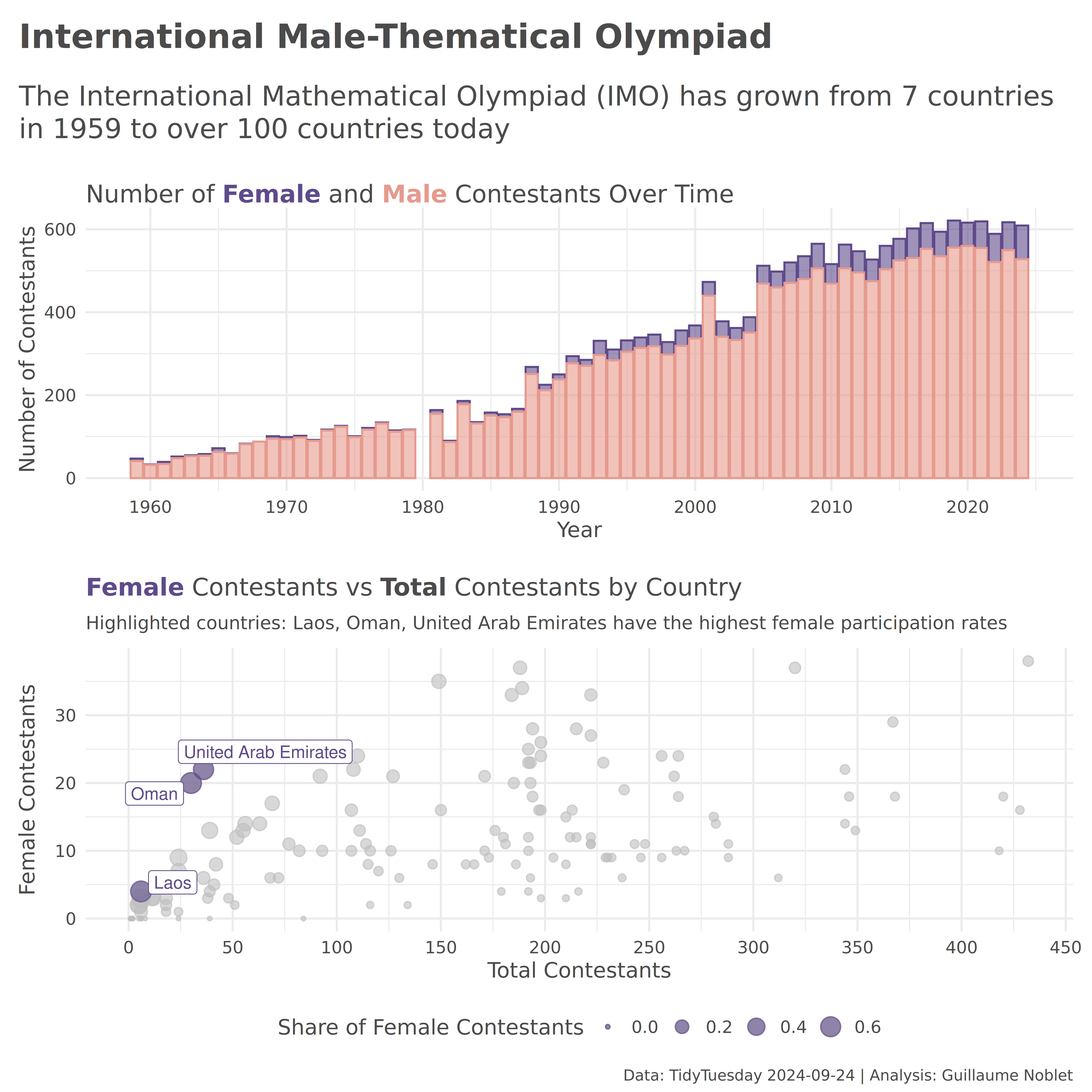 This week’s TidyTuesday explored the International Mathematical Olympiad (IMO) data, I look at gender participation patterns across countries and over time. The IMO is the World Championship Mathematics Competition for High School students, held annually since 1959.