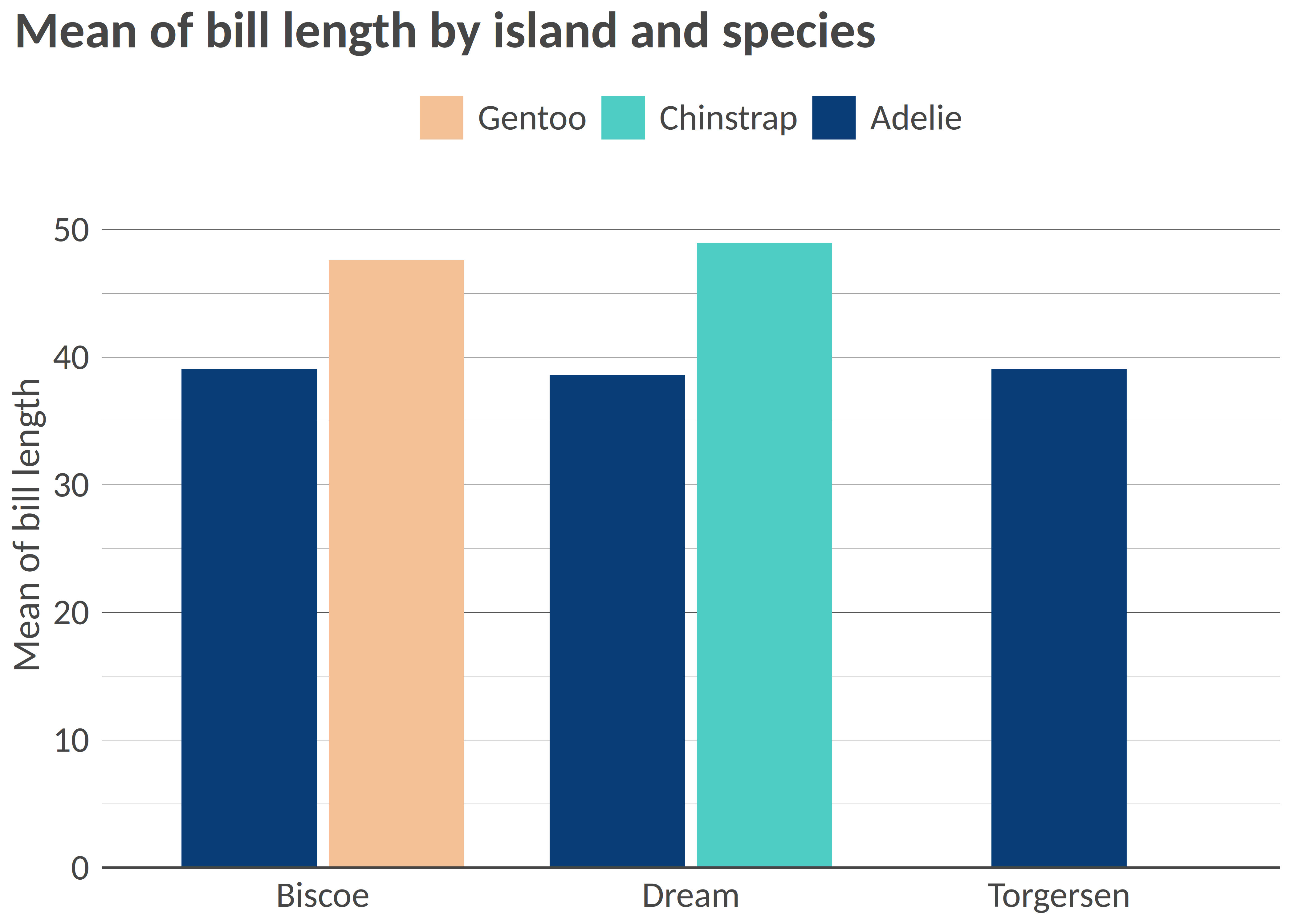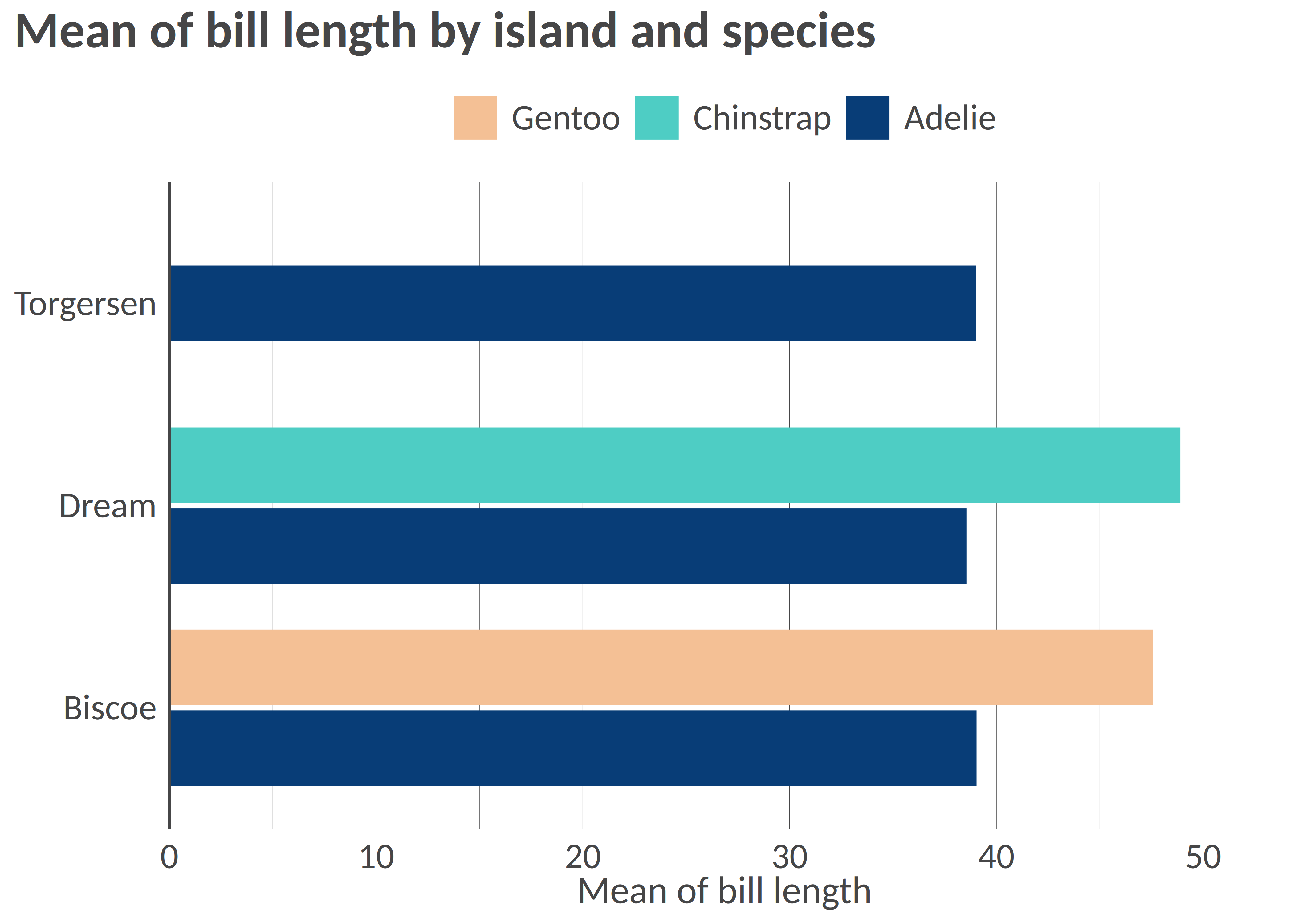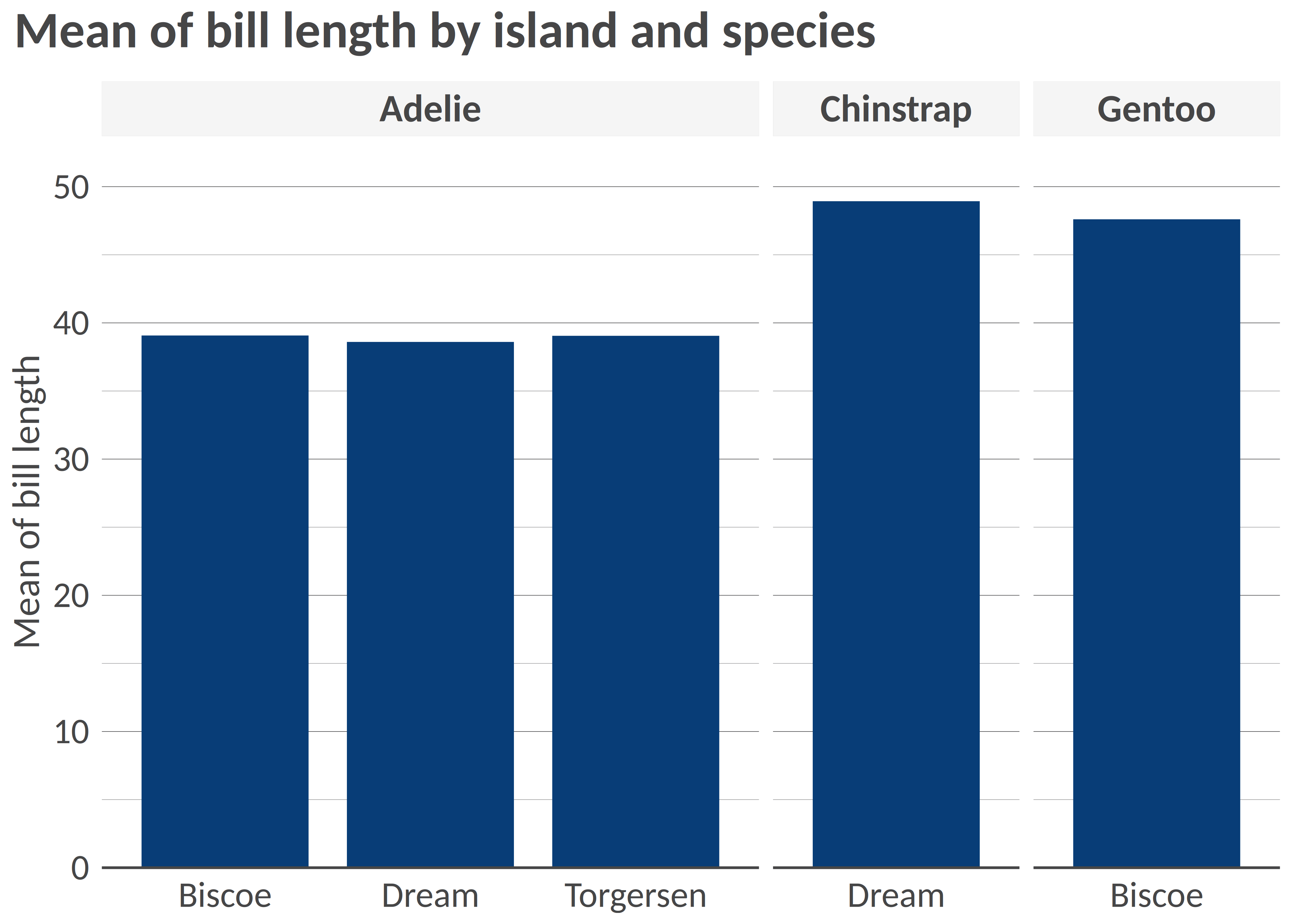 bar(df, "island", "mean_bl", facet = "species", x_title = "Mean of bill length", title = "Mean of bill length by island and species", add_color_guide = FALSE)