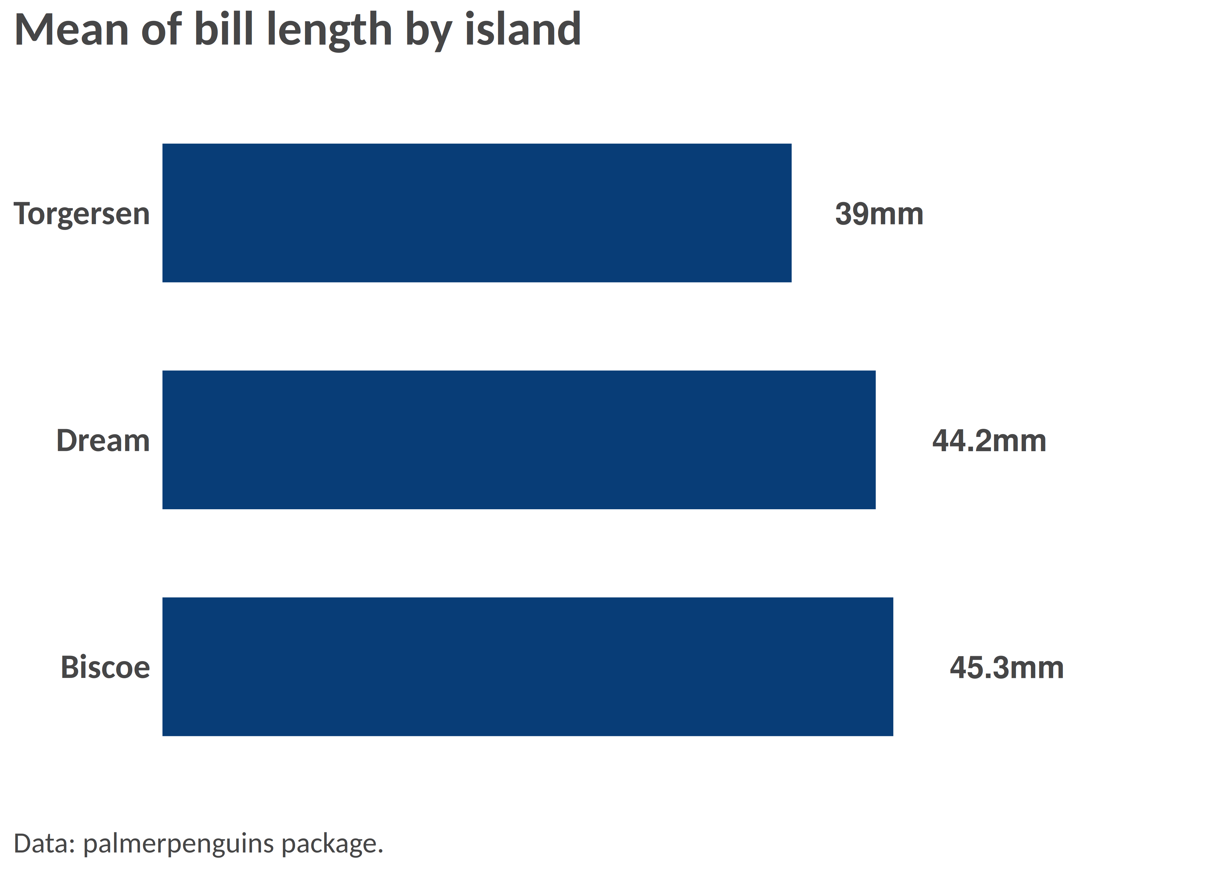 hbar(df = df_island, x = "island", y = "mean_bl", title = "Mean of bill length by island", add_text = T, width = 0.6, add_text_suffix = "mm", add_text_expand_limit = 1.3, add_color_guide = FALSE, caption = "Data: palmerpenguins package.")