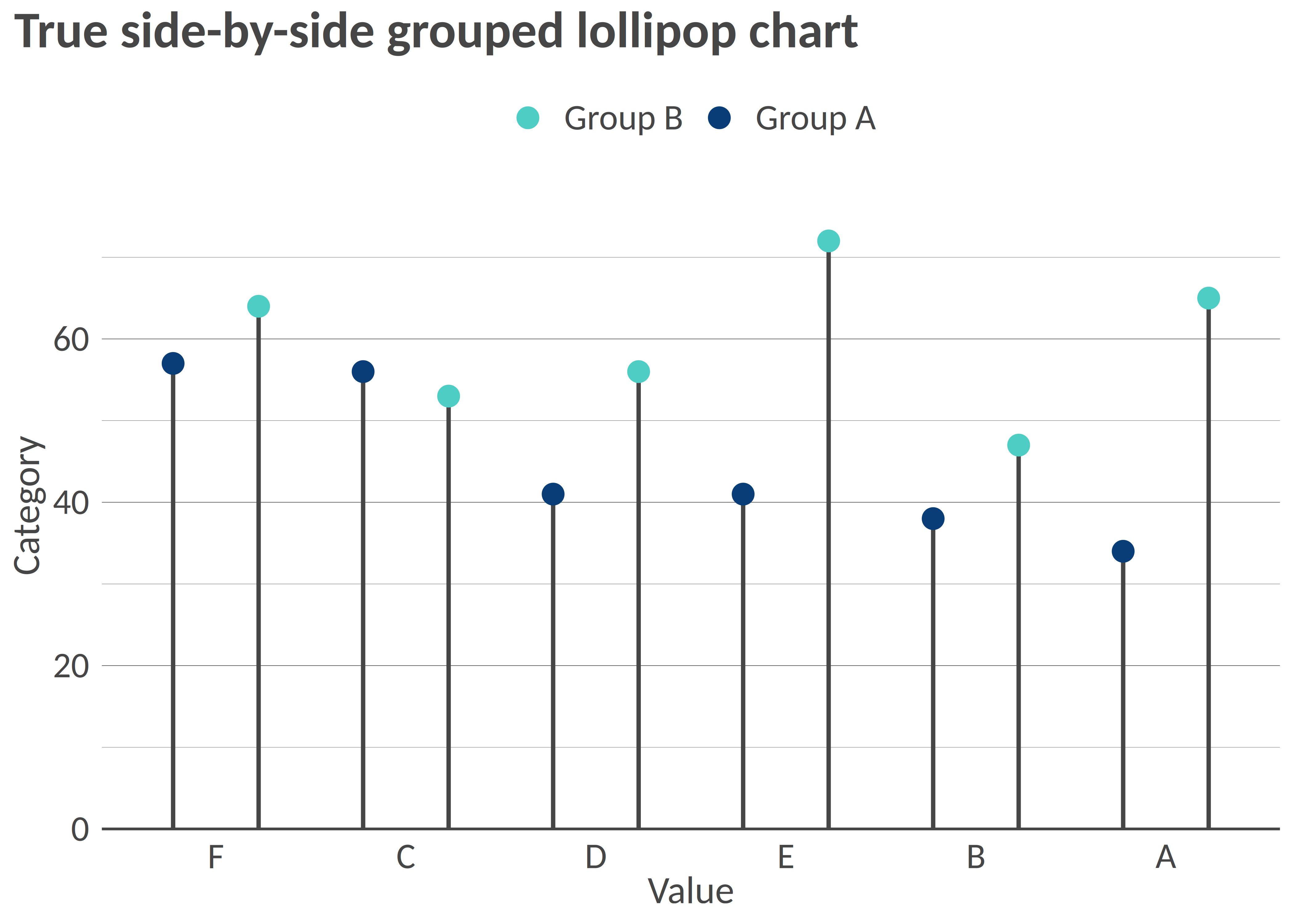 title = "True side-by-side grouped lollipop chart"