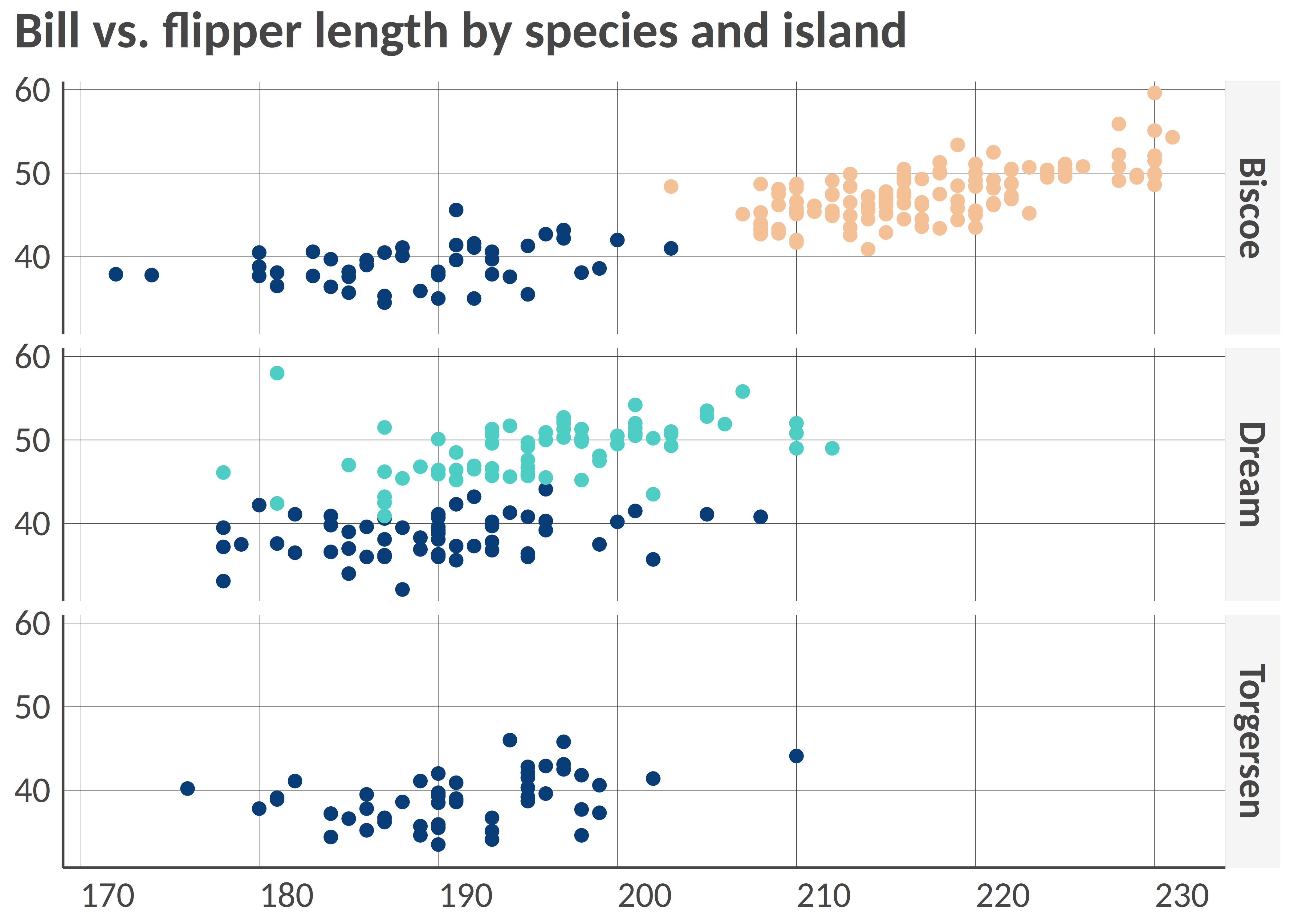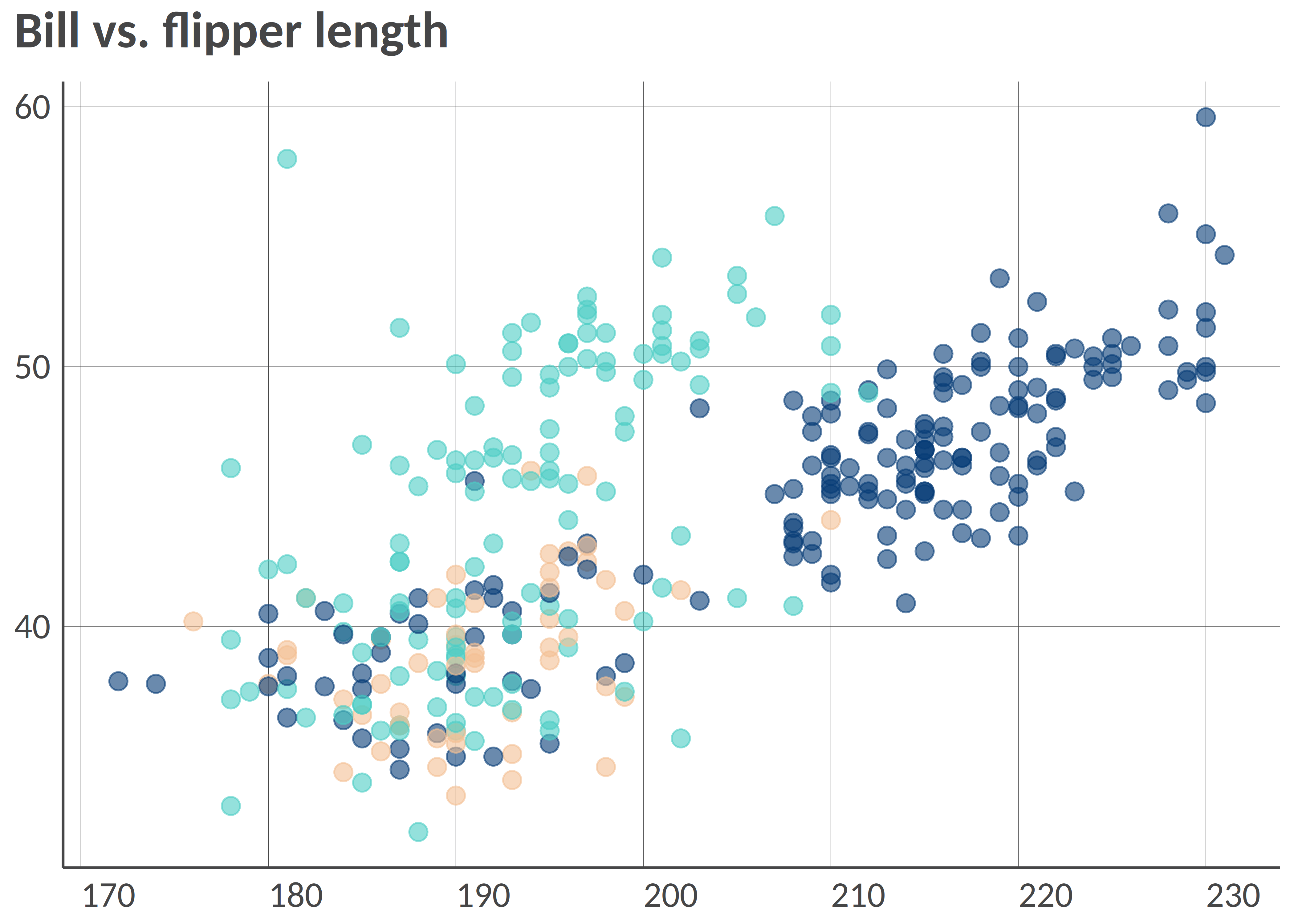 point(penguins, "bill_length_mm", "flipper_length_mm", "island", group_title = "Island", alpha = 0.6, size = 3, title = "Bill vs. flipper length", , add_color_guide = FALSE)